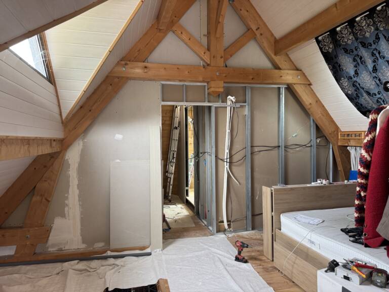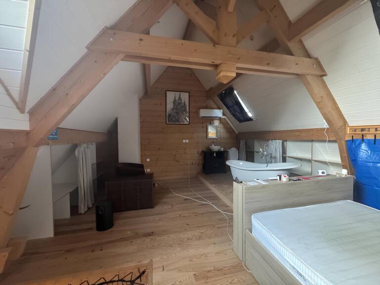 L’espace sous combles, bien que charmant grâce à sa charpente apparente, manquait de fonctionnalité. La pièce servait de chambre mais ne disposait pas d’un aménagement adapté : isolation insuffisante, rangements limités et absence d’une salle d’eau moderne. Le projet visait à transformer cet espace en une véritable suite parentale confortable et contemporaine.