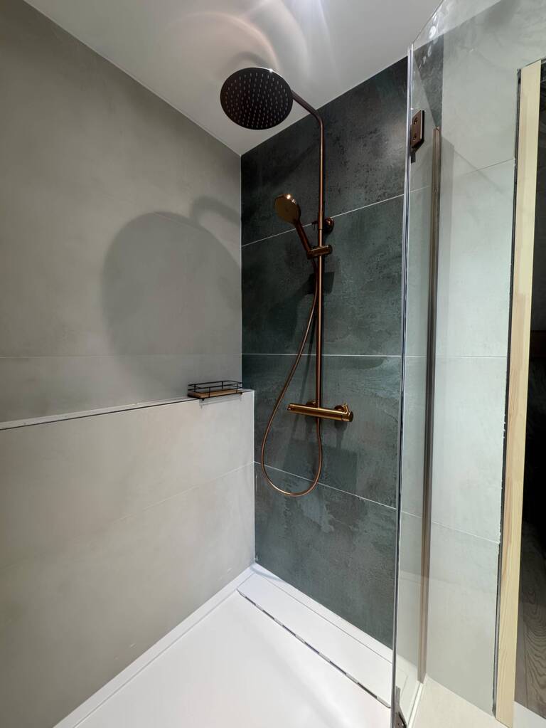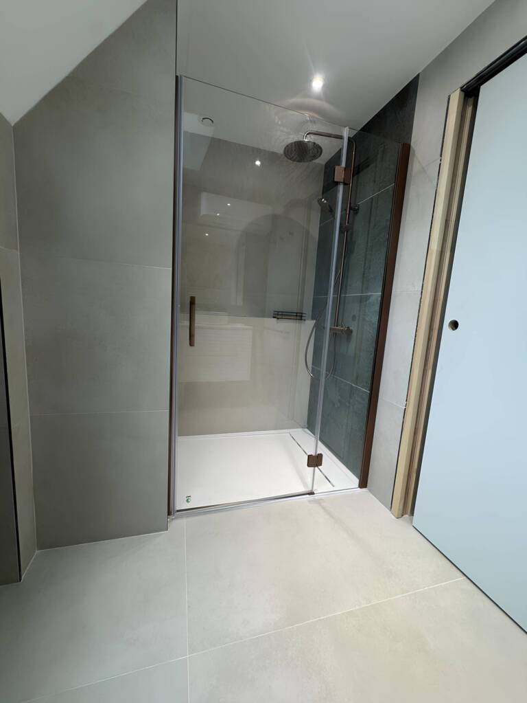 La rénovation a permis de métamorphoser les combles en un lieu de vie à la fois élégant et pratique. Une salle de bain moderne y a été intégrée, équipée d’une douche spacieuse avec paroi vitrée, d’un meuble vasque suspendu au design épuré et de sanitaires discrets. L’aménagement tire pleinement parti de la lumière naturelle, mise en valeur par une fenêtre de toit qui illumine l’ensemble. Les matériaux, sobres et raffinés, apportent une touche contemporaine tout en respectant l’architecture existante. Cette transformation aboutit à la création d’une véritable suite parentale complète, alliant confort, esthétisme et optimisation de l’espace sous pente.